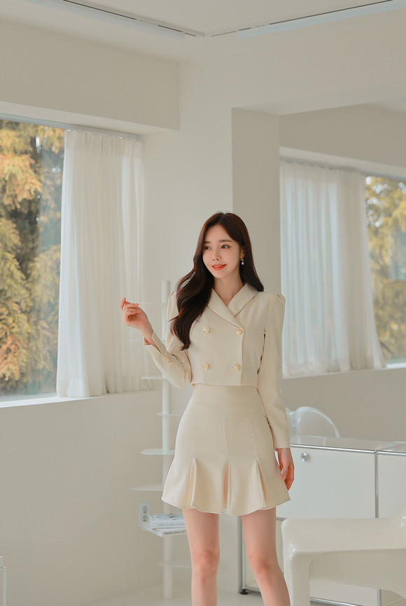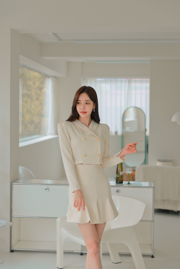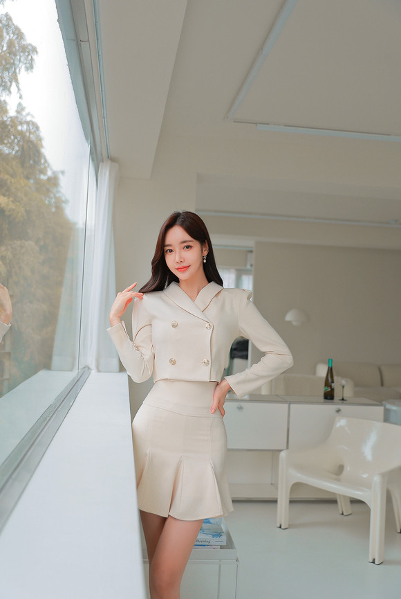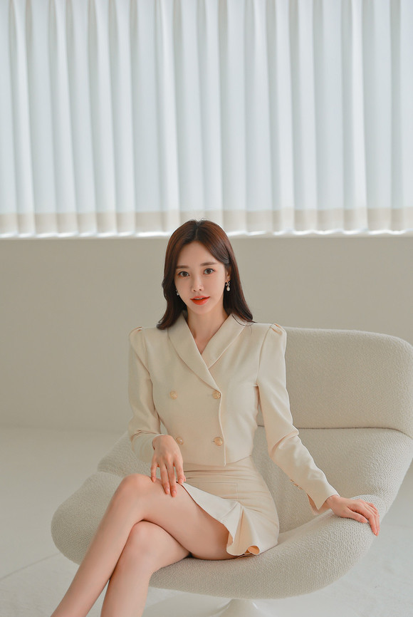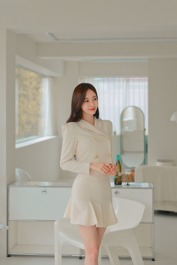 女孩身着米色西装裙,剪裁合体的设计完美展现她的曼妙身姿。裙摆的荷叶边增添了一丝柔美,搭配裸色高跟鞋,拉长腿部线条,更显高挑。整体造型既专业又不失女性魅力,是职场女性的时尚典范。